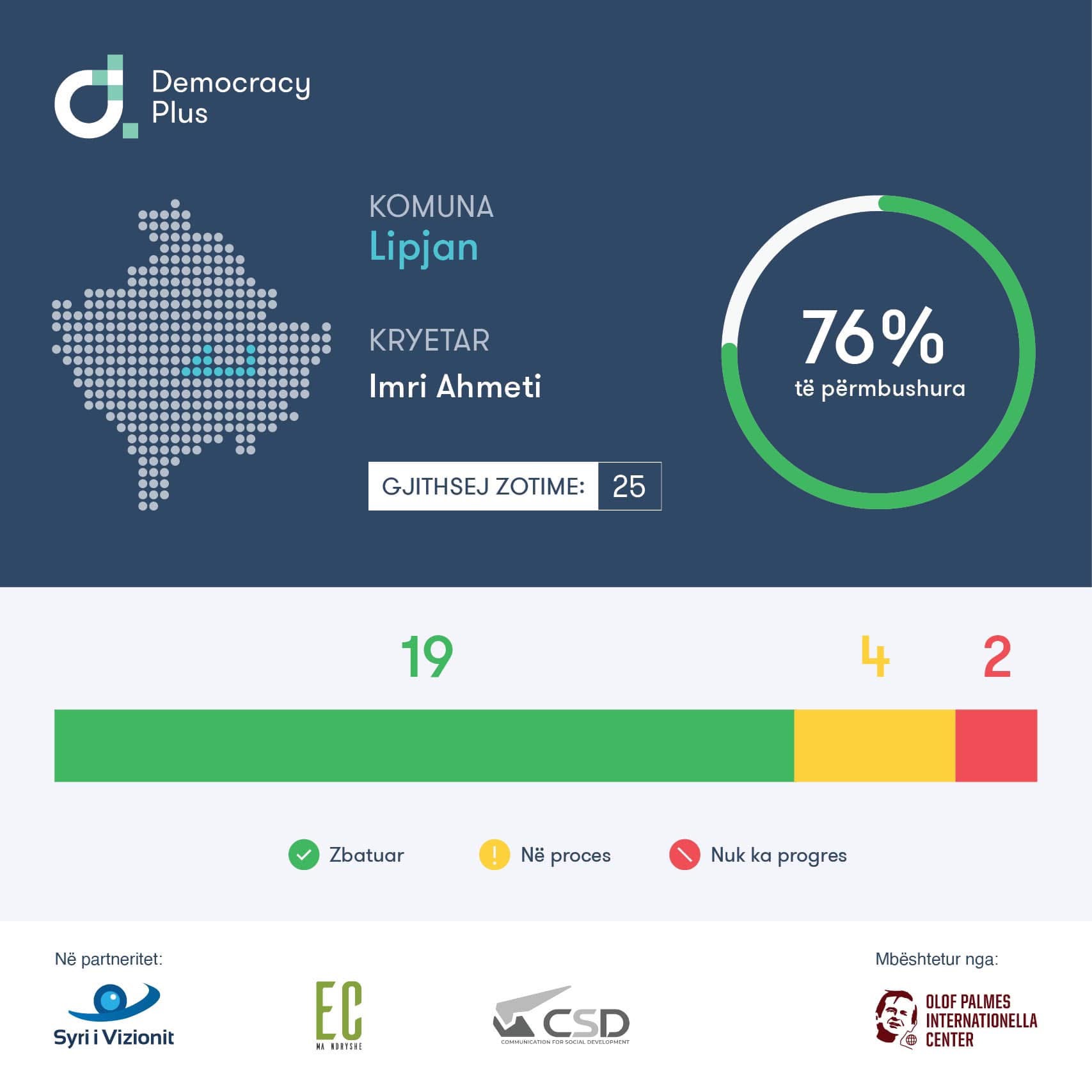 Sipas një raporti të publikuar nga organizata e shoqërisë civile Demokracia Plus, kryetari i Komunës së Lipjanit, Imri Ahmeti, ka përmbushur 76% të zotimeve të dhëna gjatë fushatës për zgjedhjet lokale të vitit 2021. Raporti thekson se nga 25 premtimet e bëra, Ahmeti ka realizuar plotësisht 19 prej tyre, ndërsa 4 projekte janë në proces zbatimi dhe 2 ende nuk kanë nisur.